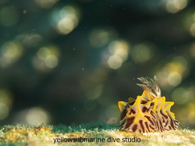 写真題名「パイナップルウミウシ魚星空観察」キャプション 80年ぶりという、真夏のような気温の石垣島のお正月。快晴の夜空には、満点の星が降り、海の中にも星空のような光景が。背景にキンメモドキの群星。群星に願いを込めているかのようなウミウシを発見。ウミウシにも願い事があるんだね。そう、思わせてくれた一瞬でした。
