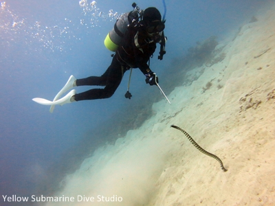 頭を砂地に突っ込んだまま動かないウミヘビ。