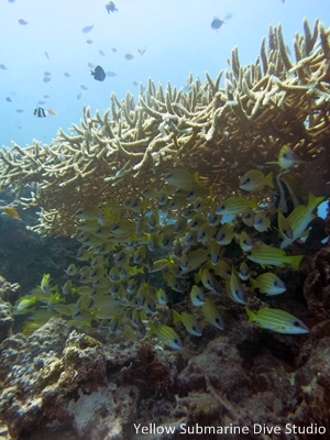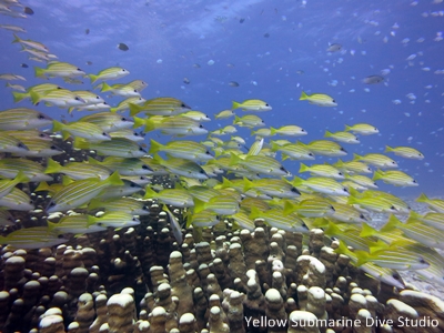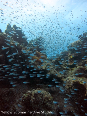 ダイビングをしていて色んな楽しみがありますが、この海の青にヨスジフエダイやデバスズメダイがたっくさん群れている感じっ♪