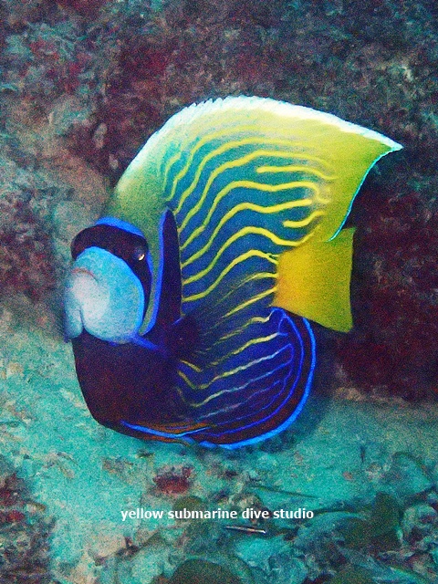 うすい小さな根に新たに根付いていたタテジマキンチャクダイの幼魚。