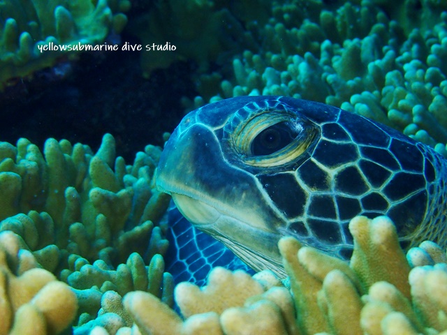 代わりにソフトコーラルの上でお休み中のカメさん。