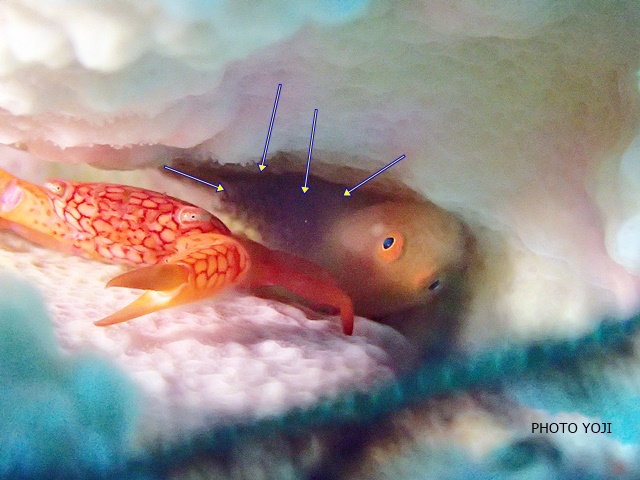 アミメサンゴガニとのコラボなんかも面白く観察できています。(笑) 矢印は 卵です。