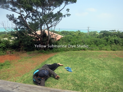 峰船長、芝生に寝転がって青い海を堪能中…。