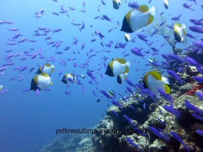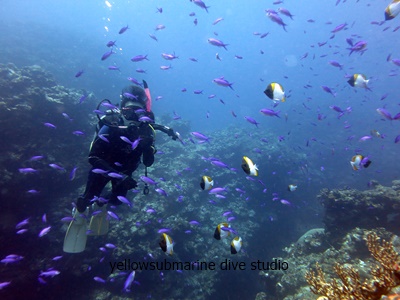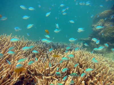 変わらず色彩豊かなサンゴ群の中、カラフルな魚と共に