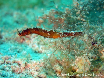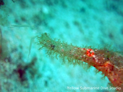 0805-8カミソリウオの捕食シーン!口の先からカクレエビと思われる手が見れます。こんなネイチャーシーンに出会えるのもダイビングの魅力ですね!
